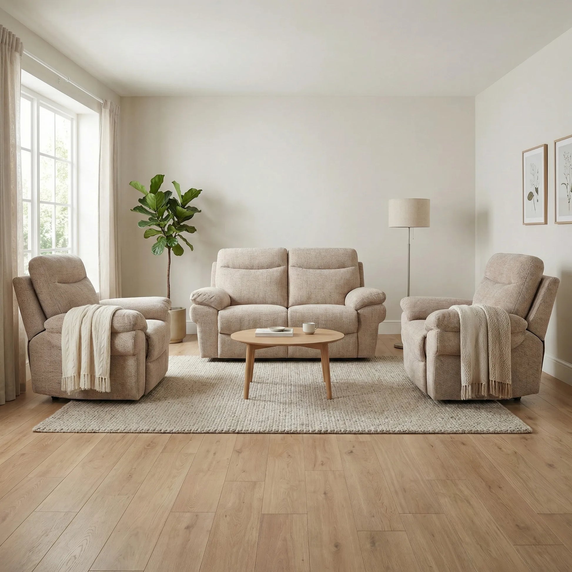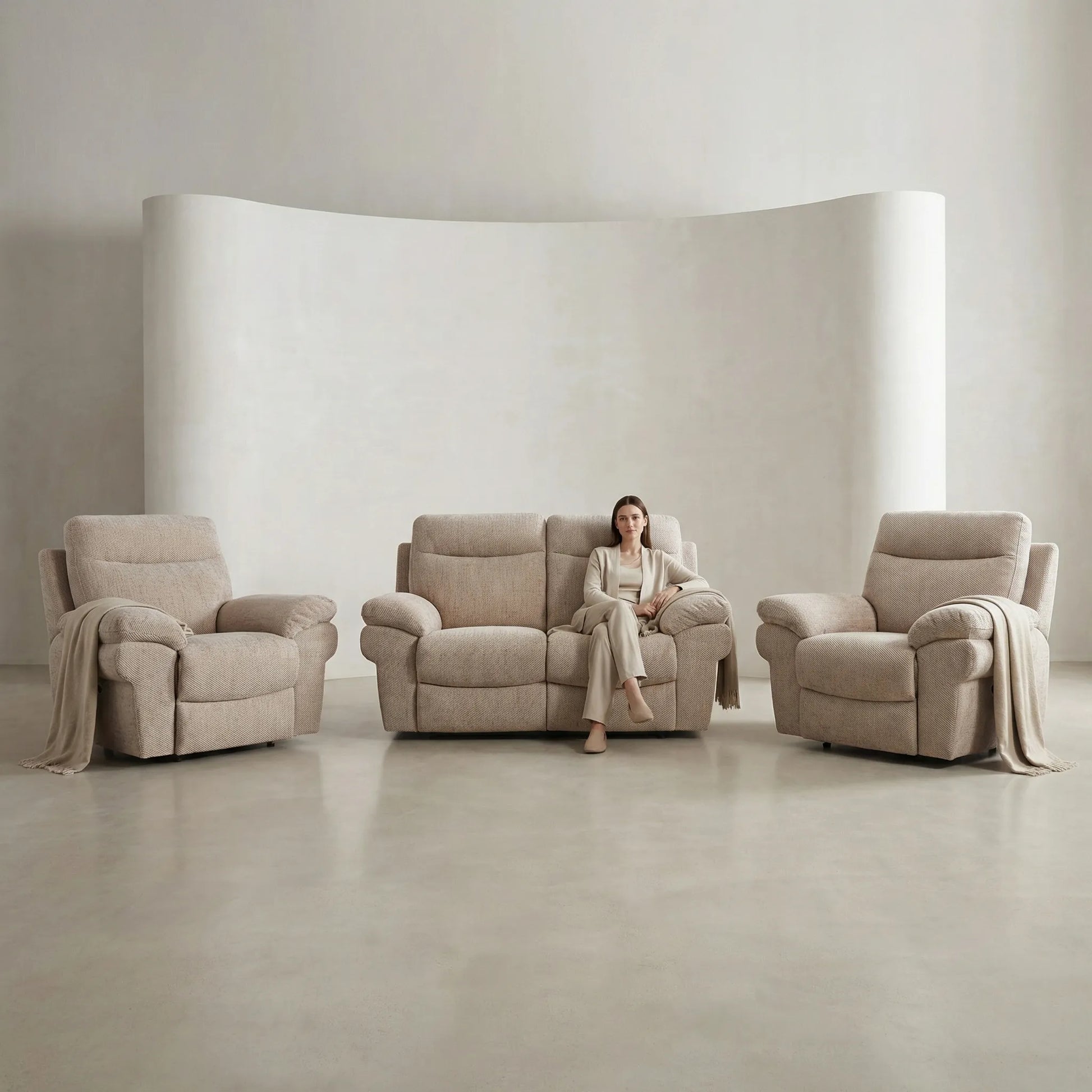Relax in style with the Tanya Beige Fabric Electric Recliner 2+1+1 Seater Sofa Set, a perfect blend of comfort, function, and modern design. This set includes a spacious 2-seater recliner sofa and two matching single recliner armchairs, offering plenty of room for family and guests while keeping your living space open and inviting.